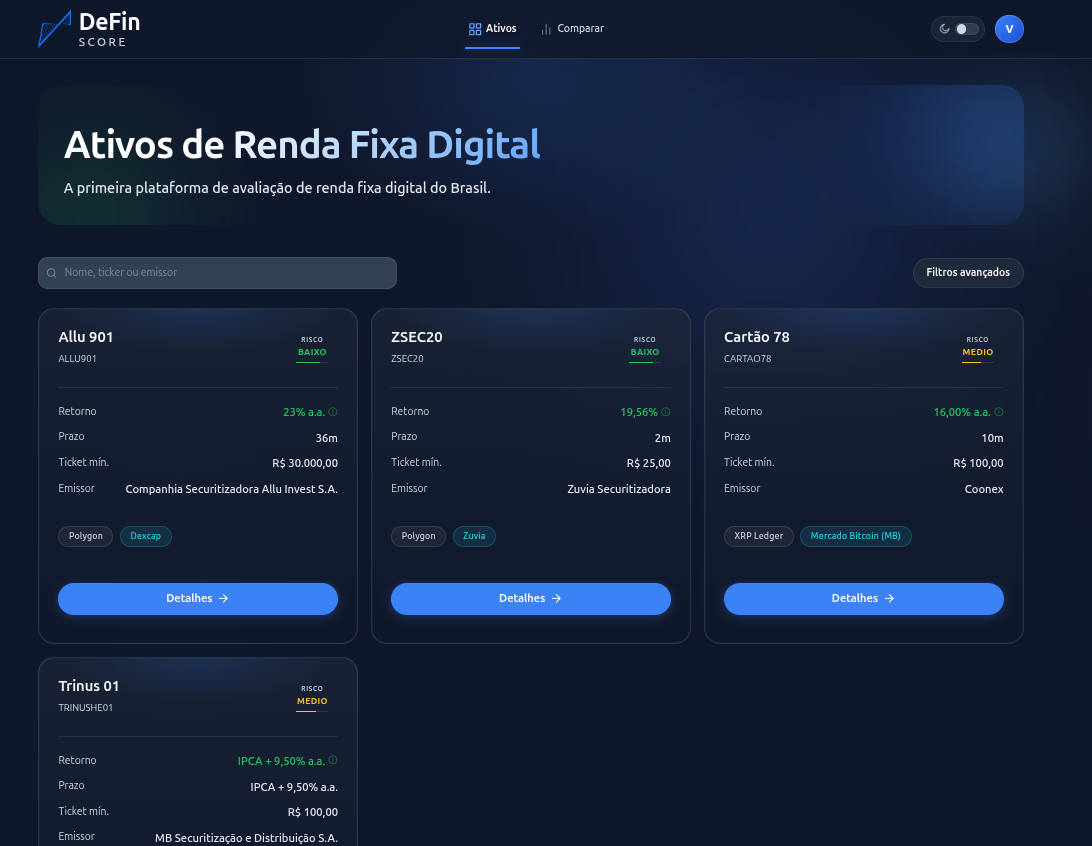 Apresentamos o DeFin Score. Uma plataforma independente que audita, classifica e monitora tokens de crédito privado, garantindo transparência institucional para cada ativo emitido em blockchain.